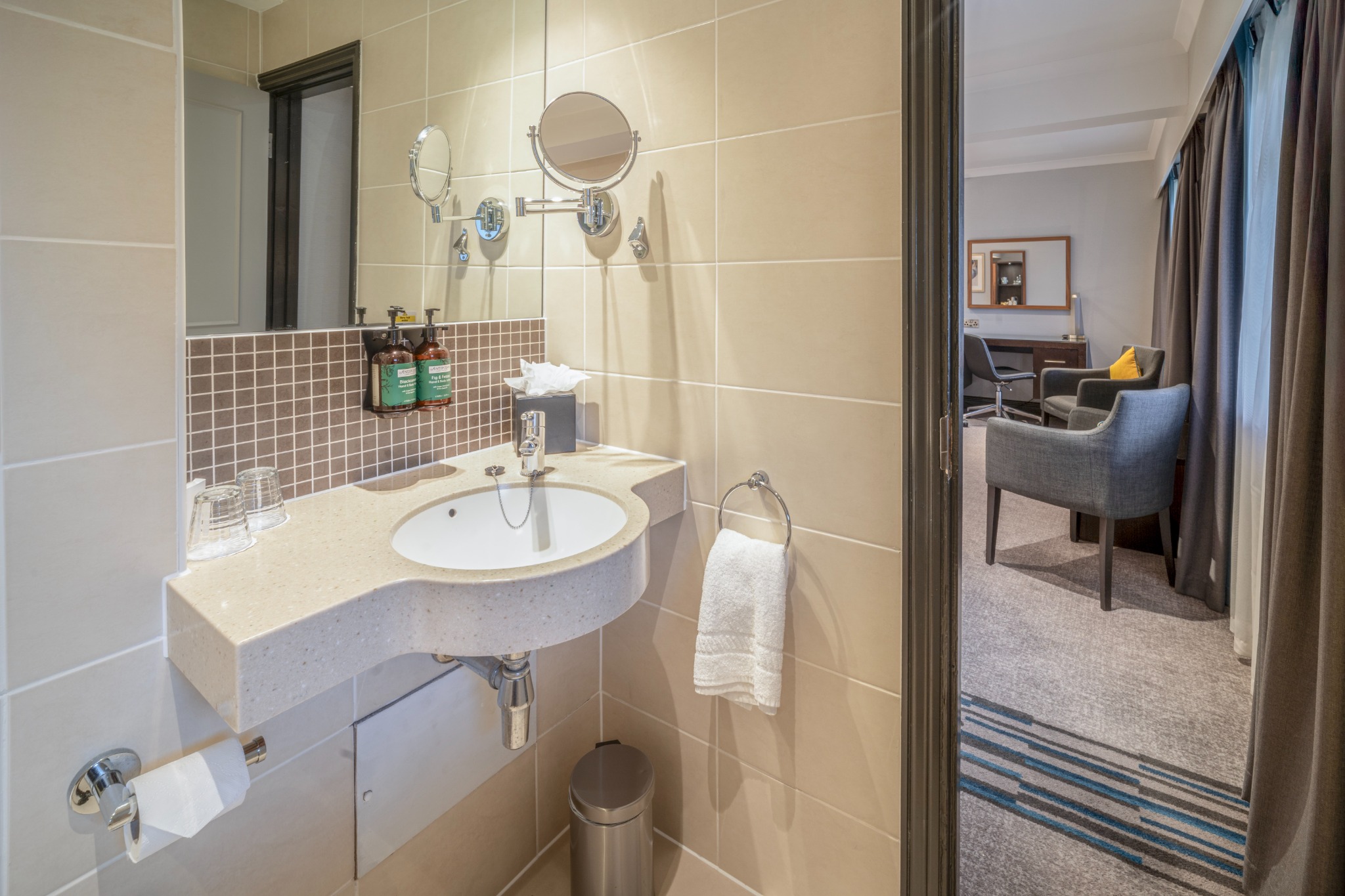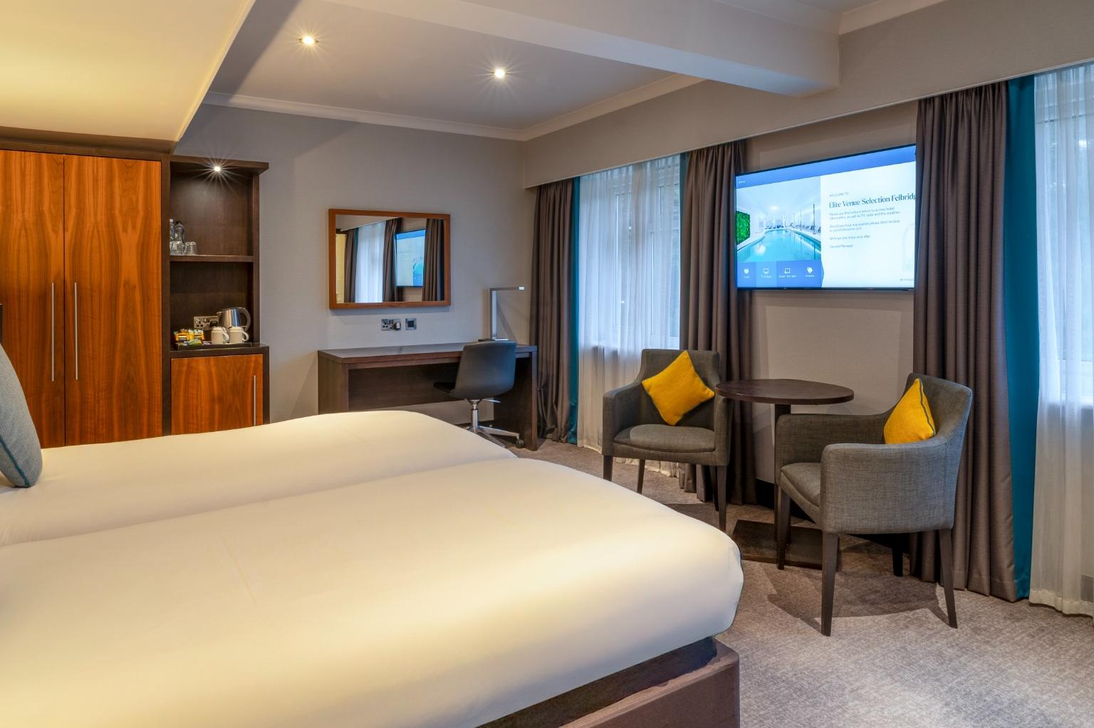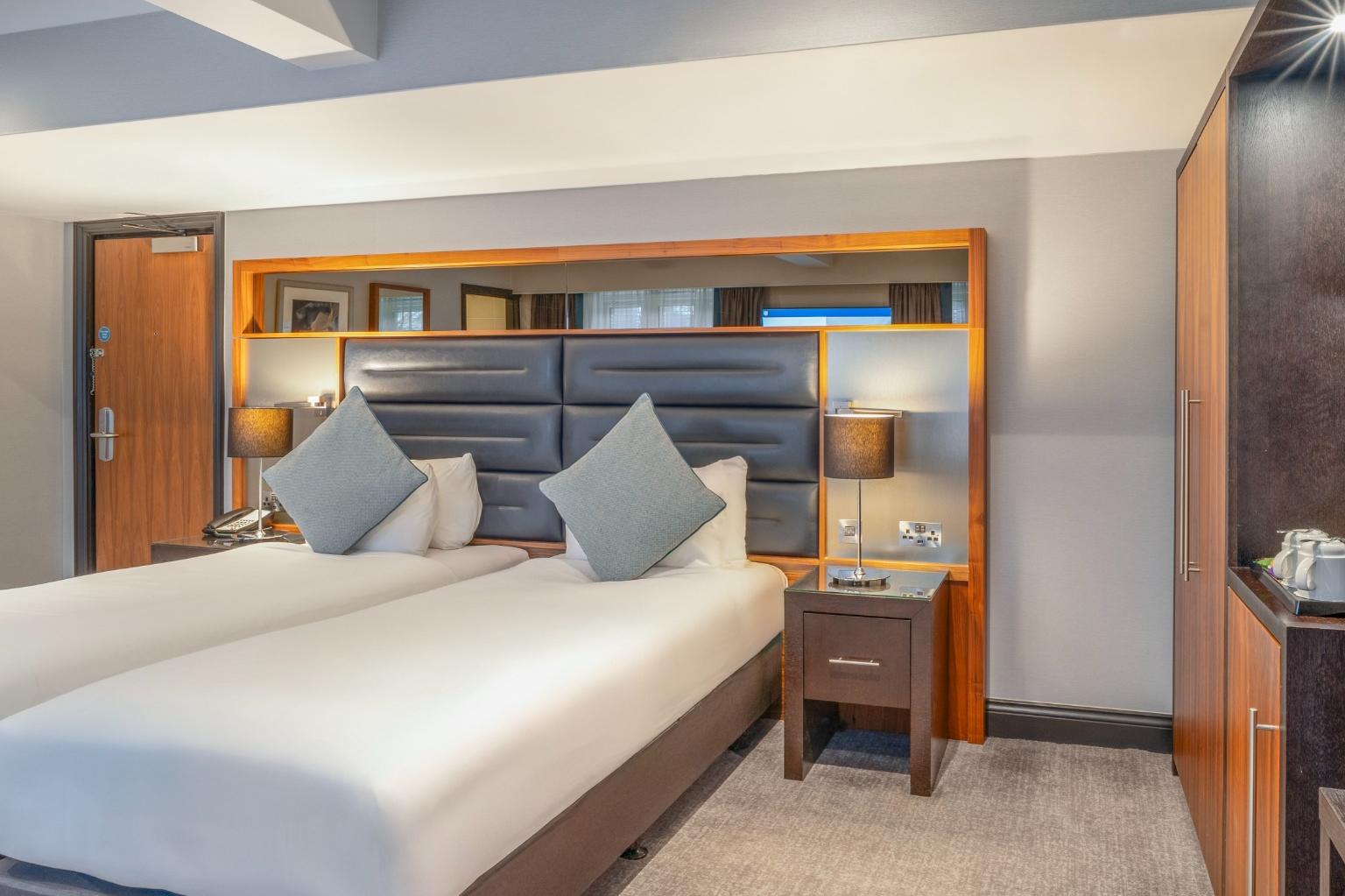 A stylish Twin Room offering everything you need for a comfortable and enjoyable stay. Filled with natural light and elegant décor, it provides the convenience of complimentary Wi-Fi, a private en-suite bathroom, and in-room essentials including a television and other modern features. The room also presents a cosy carpeted layout and thoughtful details designed to enhance your experience.