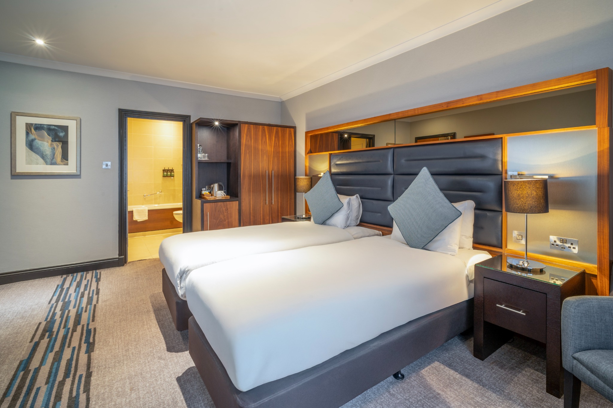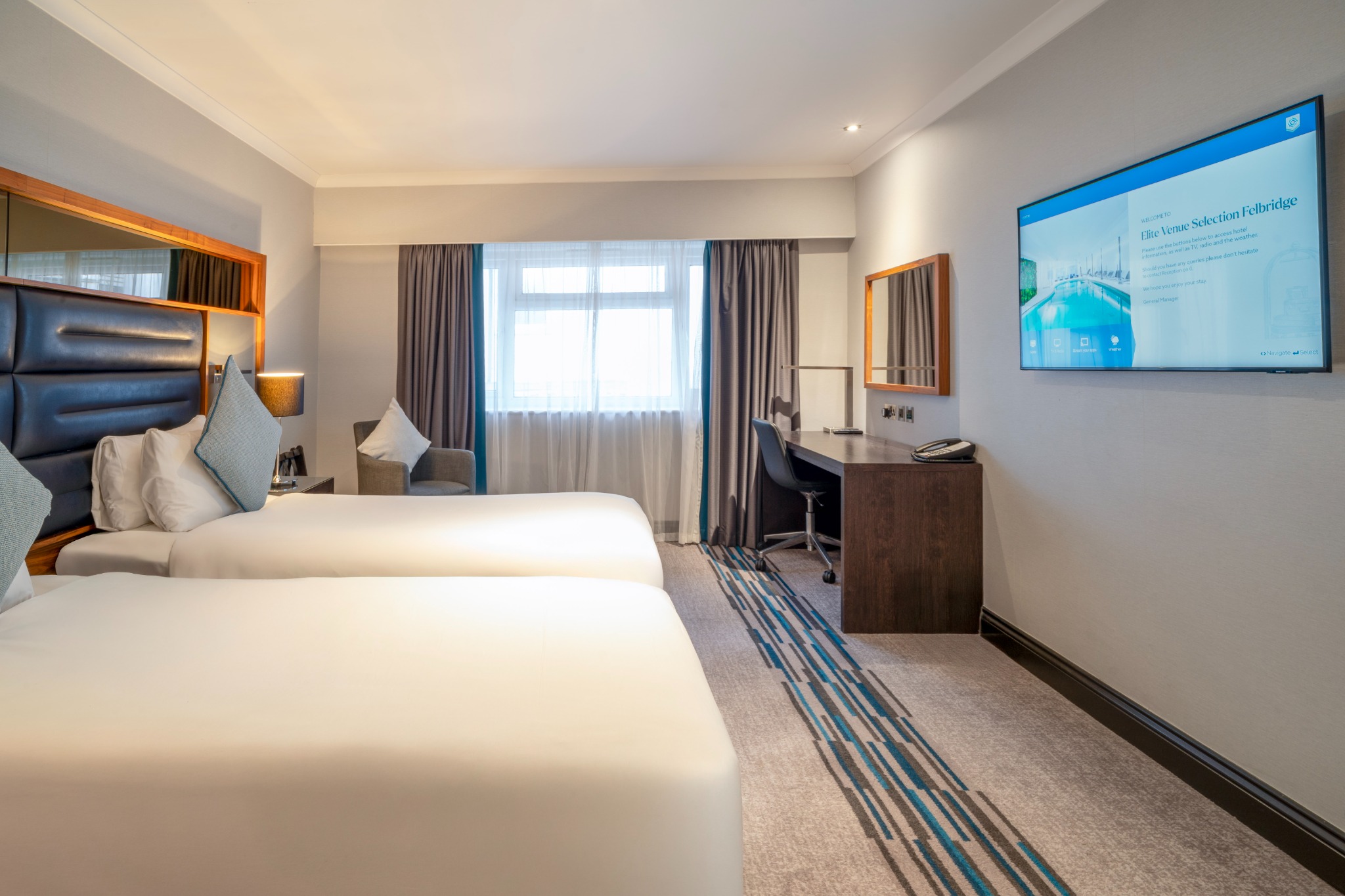 A stylish Twin Room offering everything you need for a comfortable and enjoyable stay. Filled with natural light and elegant décor, it provides the convenience of complimentary Wi-Fi, a private en-suite bathroom, and in-room essentials including a television and other modern features. The room also presents a cosy carpeted layout and thoughtful details designed to enhance your experience.