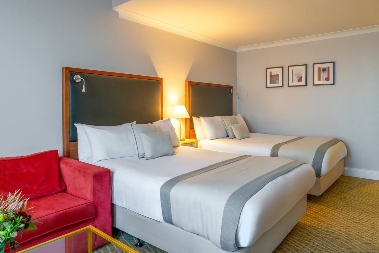 A spacious Family Room offering everything you need for a restful and enjoyable stay. Featuring two double beds, it is filled with natural light and stylish décor, and provides the convenience of complimentary Wi-Fi, a private en-suite bathroom, and in-room essentials including a television and other modern features. The room also presents extra space, a cosy carpeted layout, and thoughtful details designed to make you feel at home.