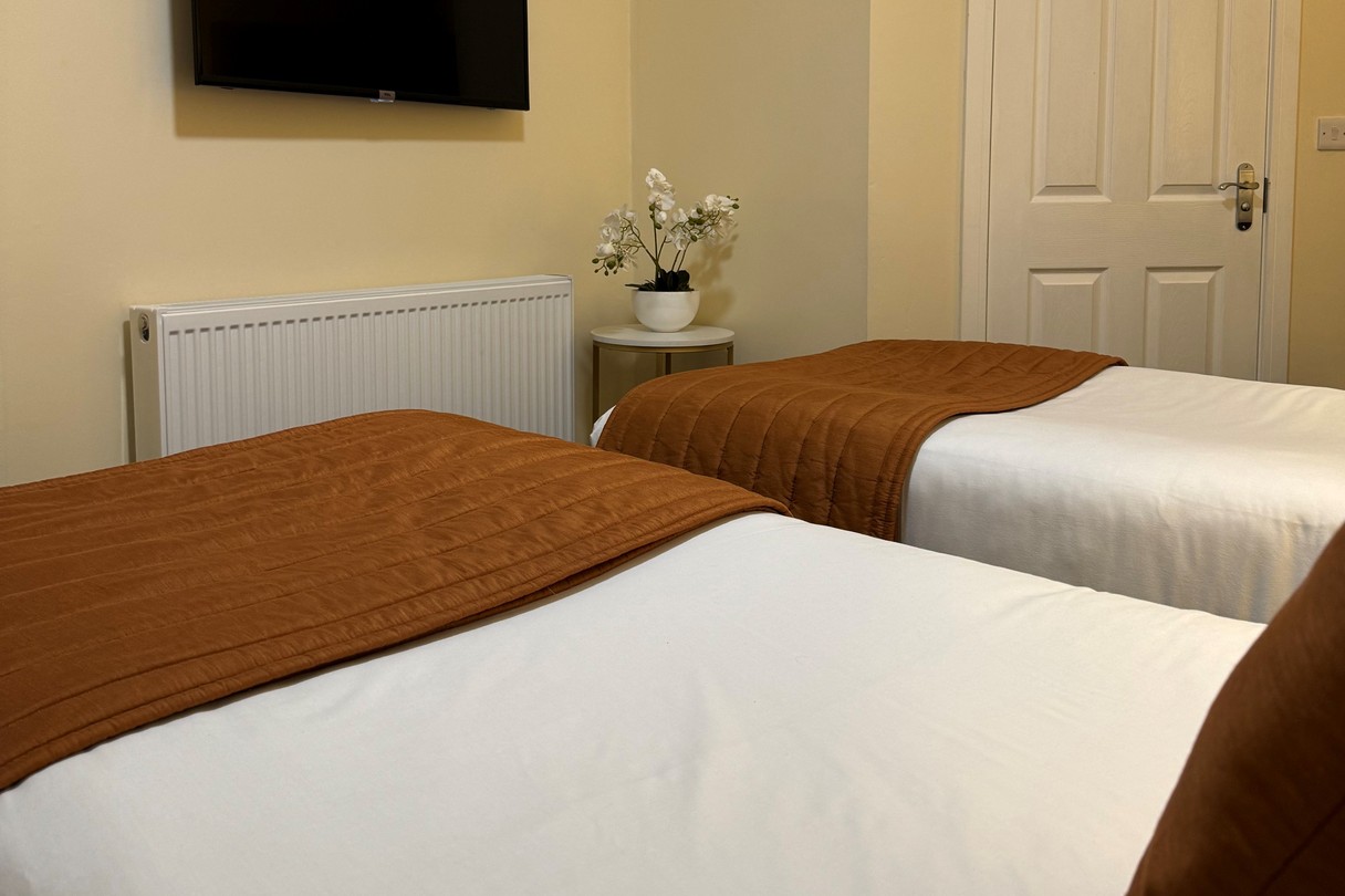 A spacious Family Room offering everything you need for a restful and enjoyable stay. Featuring two double beds, it is filled with natural light and stylish décor, and provides the convenience of complimentary Wi-Fi, a private en-suite bathroom, and in-room essentials including a television and other modern features. The room also presents a cosy carpeted layout and thoughtful details designed to make you feel at home.