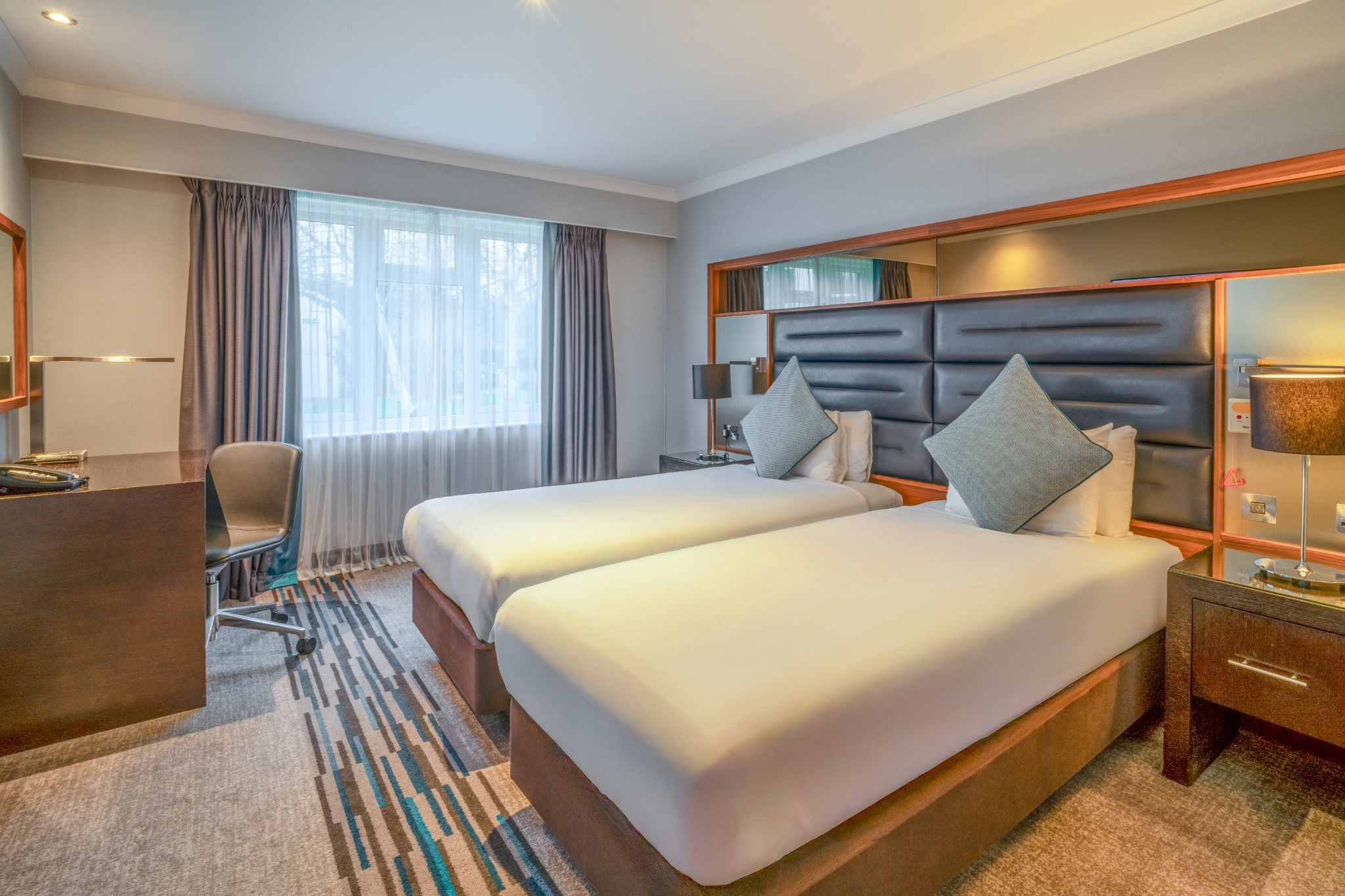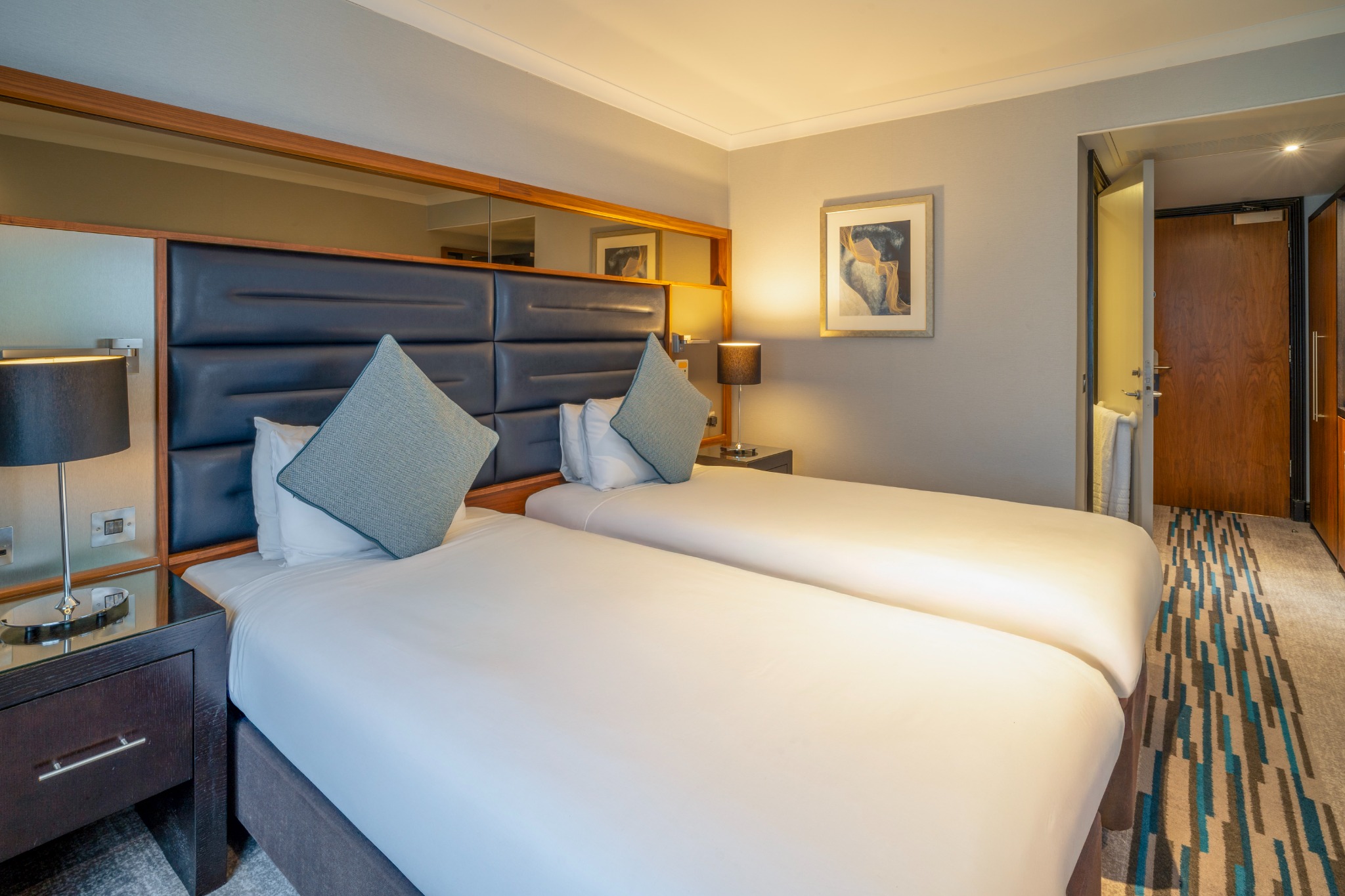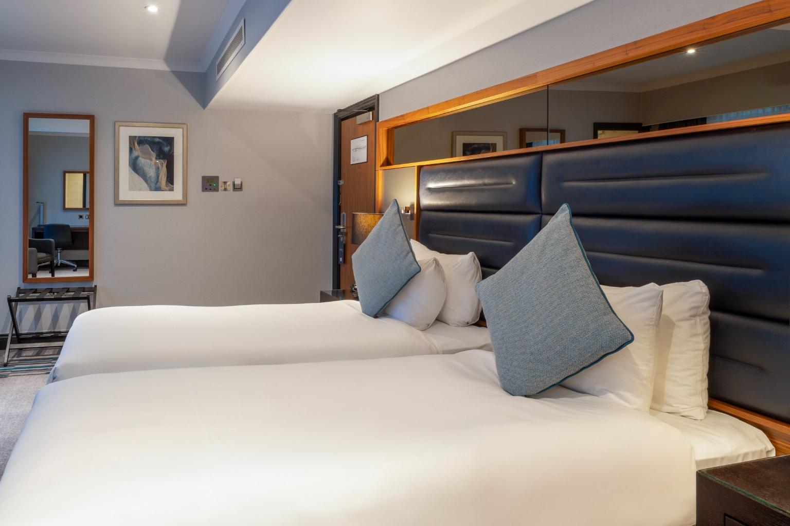 A stylish Twin Room offering everything you need for a comfortable and enjoyable stay. Filled with natural light and elegant décor, it provides the convenience of complimentary Wi-Fi, a private en-suite bathroom, and in-room essentials including a television and other modern features. The room also presents a cosy carpeted layout and thoughtful details designed to enhance your experience.