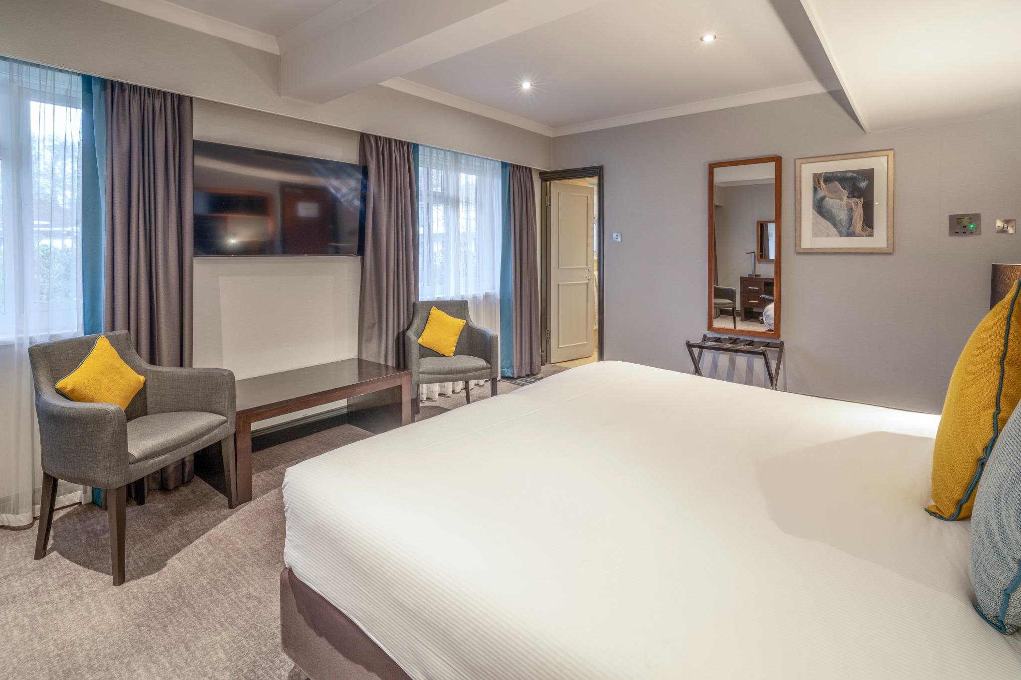 A comfortable Double or Twin Room, offering everything you need for a restful and enjoyable stay. Filled with natural light and stylish décor, it provides the convenience of complimentary Wi-Fi, a private en-suite bathroom, and in-room essentials including a television and other modern features. The room also presents a cosy carpeted layout and thoughtful details designed to make you feel at home.