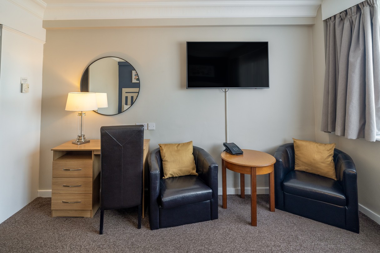 One of our most luxurious rooms, offering everything you need for a truly relaxing and enjoyable stay. Filled with abundant natural light and elegant décor, it provides the convenience of complimentary Wi-Fi, a private en-suite bathroom, and in-room essentials including a television and other modern features. The room also presents a separate seating area, a cosy carpeted layout, and thoughtful details designed to enhance your comfort.
