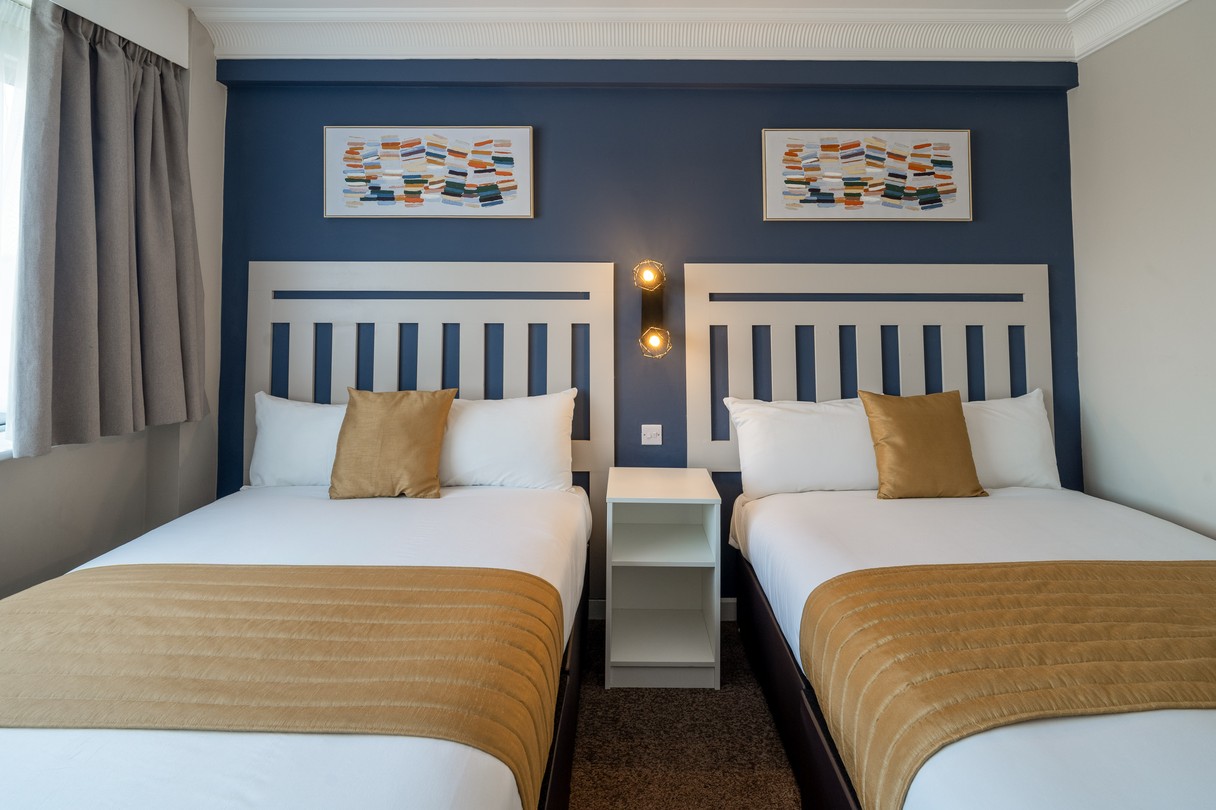 A spacious Family Room offering everything you need for a restful and enjoyable stay. Featuring two double beds, it is filled with natural light and stylish décor, and provides the convenience of complimentary Wi-Fi, a private en-suite bathroom, and in-room essentials including a television and other modern features. The room also presents extra space, a cosy carpeted layout, and thoughtful details designed to make you feel at home.